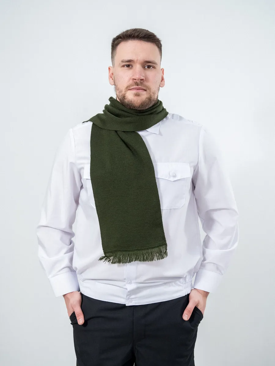 Шарф кашне мужской и женский для военнослужащих Армейский Уставной Армия России. Кашне используют при ношении форменного обмундирования, в холодное время года. Гладкий шарф с короткой бахромой по краям и эластичной вязкой.120*20 размеры шарфа. Платки форменные для Полиции МВД, ВМФ, МЧС, СВЧ.