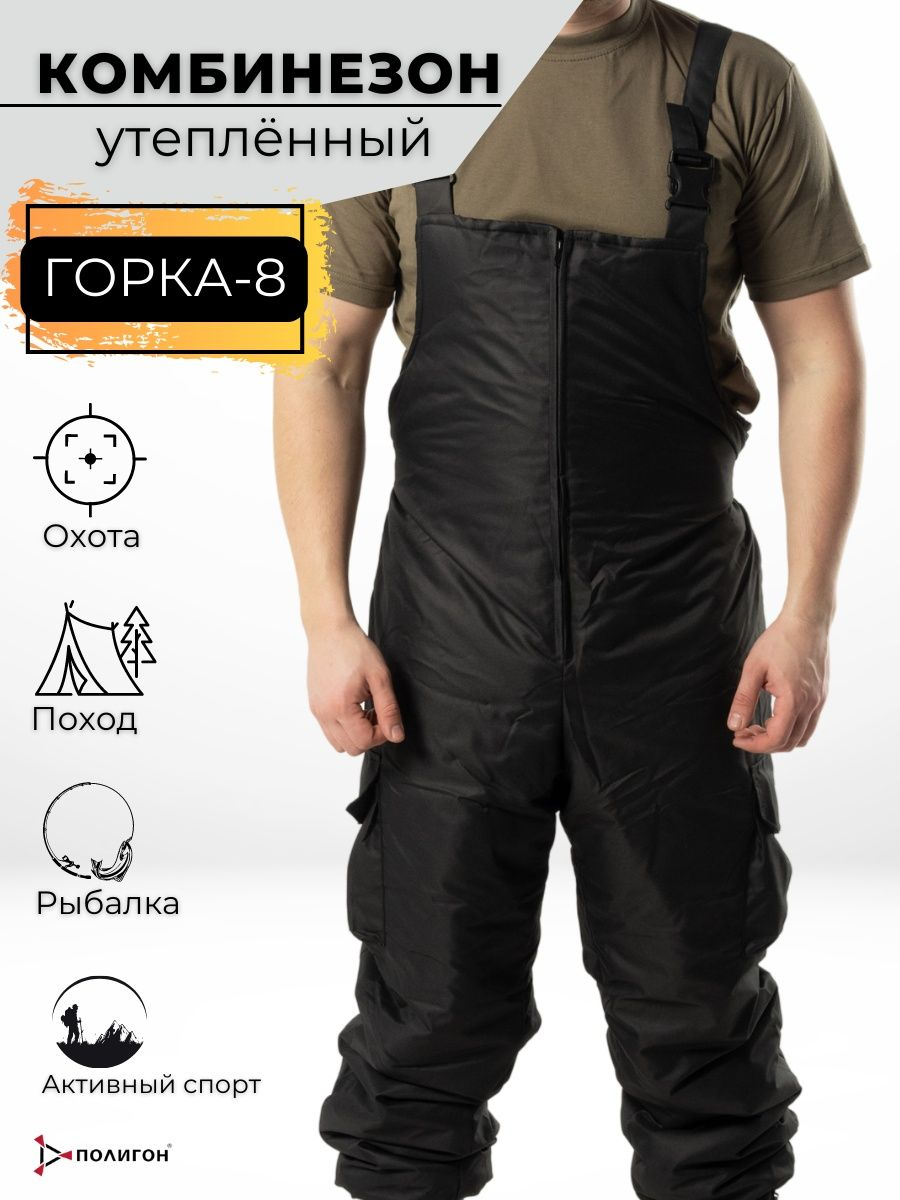 Комбинезон с центральной бортовой застежкой на тесьму-молнию, с 2 накладными объемными карманами. По линии талии стянут эластичной тесьмой. Имеются бретели с карабинами для подгонки по росту. Брюки Горка комфортны для любителей охоты, рыбалки, скалолазания, походов туризма, исследования пещер и других активных видов отдыха, для дачников, для повседневной носки в городе.