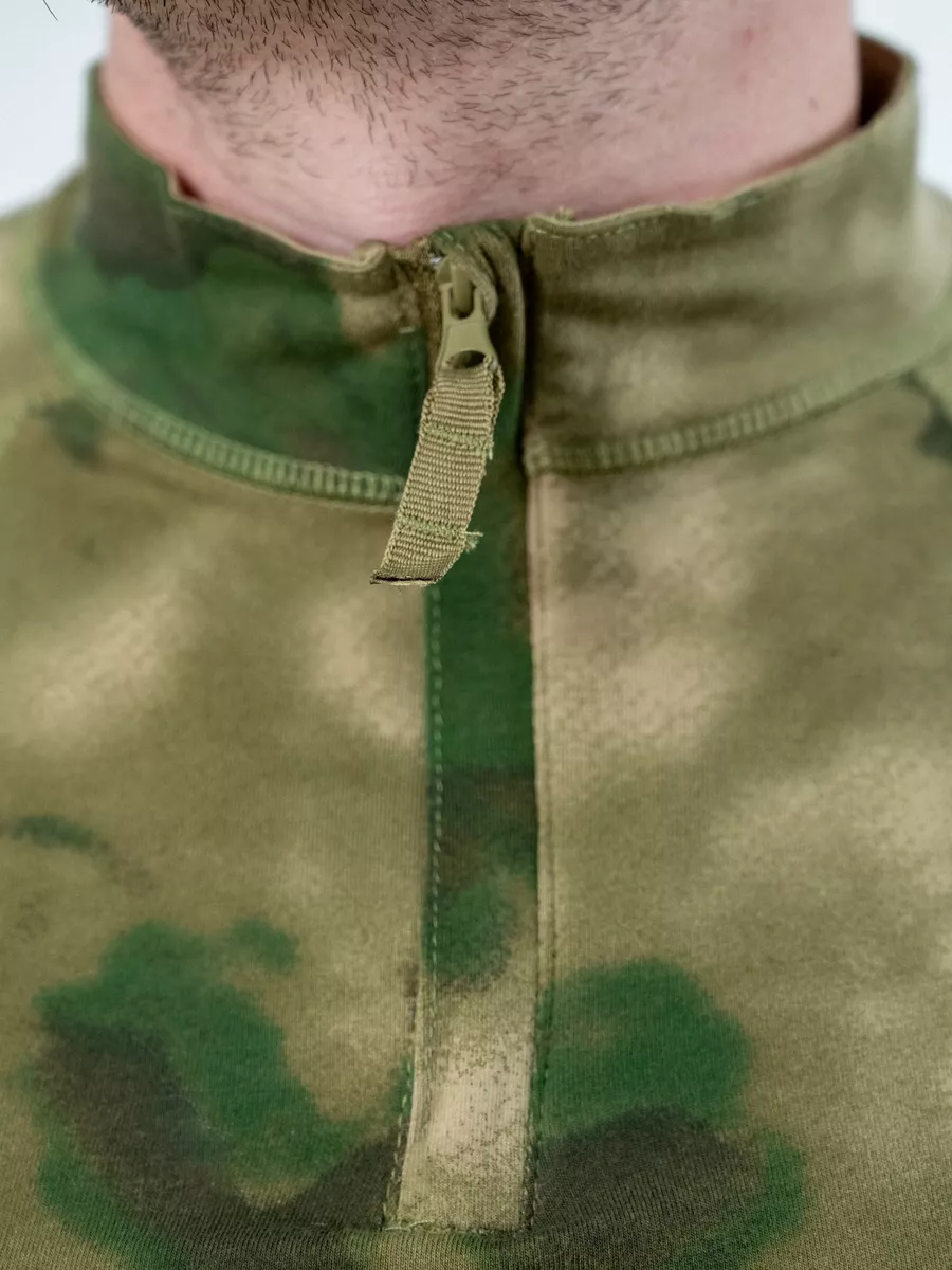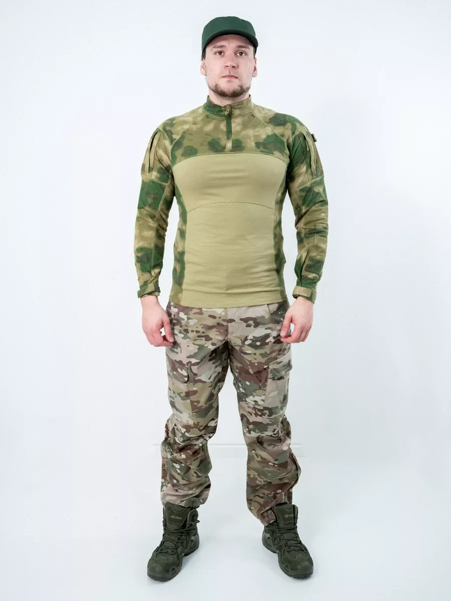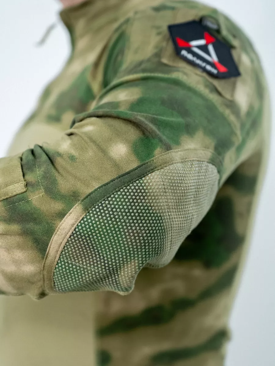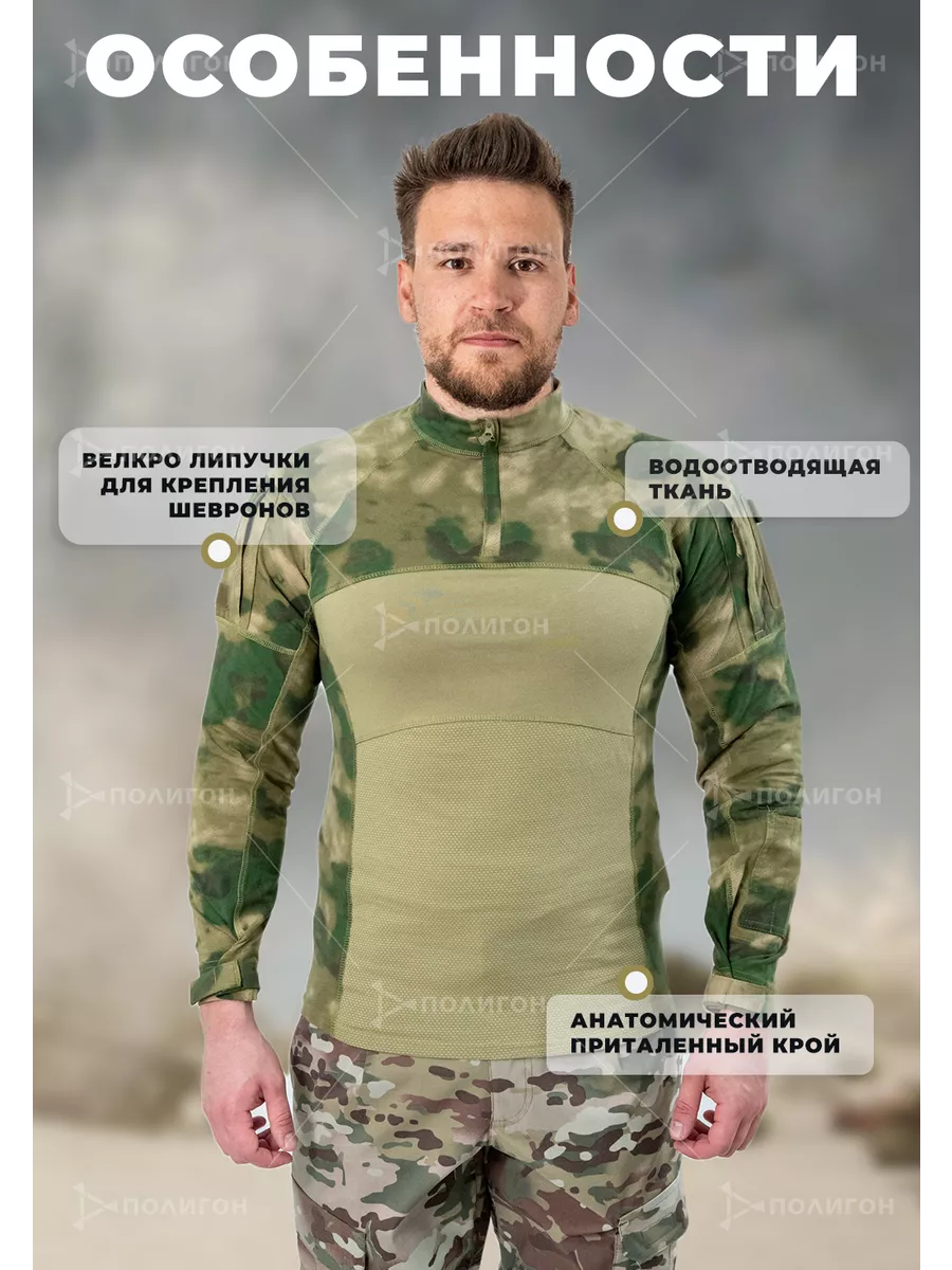 Боевая рубаха кмф в расцветке зеленый мох. Рассчитана для использования под бронежилетом или разгрузочной системы. Максимально плоские швы и отсутствие нагрудных карманов исключают дискомфорт и натирание. Имеет анатомический приталенный крой, застегивается на молнию, ворот можно носить как стойкой, так и в классическом виде. Ворот-стойка защищает не только от возможных ожогов и палящих лучей солнца, но и предотвращает возможное натирание шеи оружейным ремнем, бронежилетом или рюкзаком. Манжеты рукавов регулируются велкро липучкой. На правом рукаве расположен карман закрывающийся на невидимую молнию, на ней 3 ответных части велкро липучки (микропетли), на которые крепится шеврон, патч или нашивка. На левом рукаве в верхней части, расположен карман закрывающийся на невидимую молнию, с хлястиком на липучке снаружи. Также на карман можно крепить знаки отличия, патч флаг или шеврон. В нижней части рукава нашит небольшой органайзер карман, разделенный на две секции. Футболка с длинным рукавом выполнена из влагоотводящей ткани, нормализует микроклимат под одеждой бойца, защищает руки от солнечных лучей и от мелких механических травм. Локтевая часть рукавов усилена дополнительной тканевой прорезиненой накладкой, что позволяет избежать разрывов и повреждения изделий. Военно-полевая рубашка идеальна для повседневной носки в качестве военной формы, для охоты и рыбалки, для участия в военно-тактических и военно-спортивных играх. А также для активного отдыха на природе, для пеших прогулок и походов различной степени сложности, в том числе горных походов.