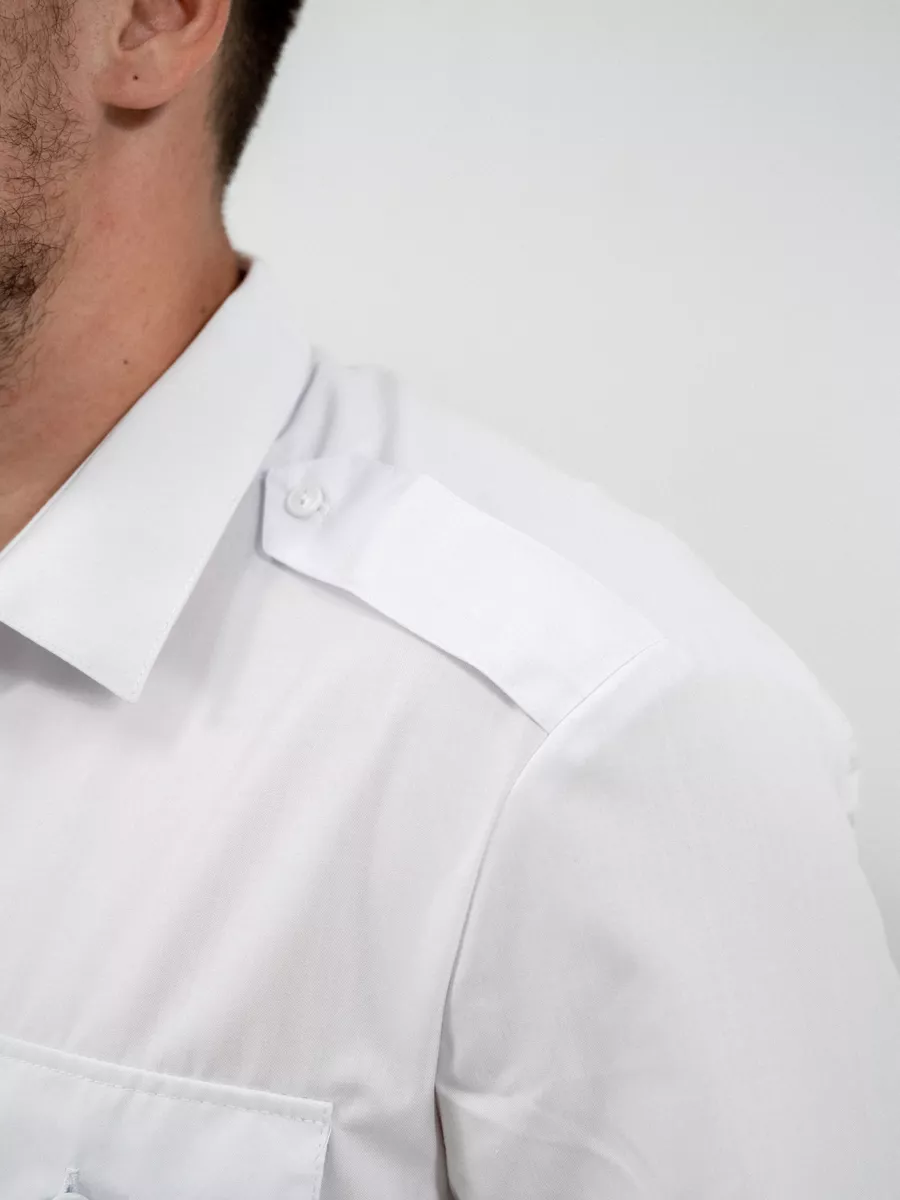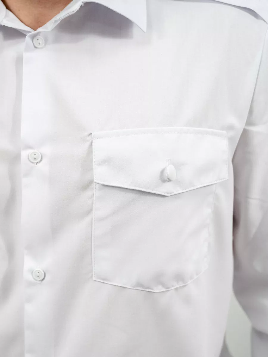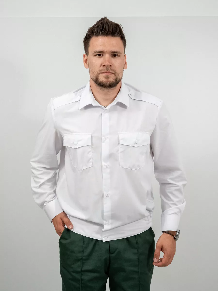 Рубашка РЖД белая мужская длинный рукав. Форменная, летняя рубашка, мужская, РЖД. Белая рубашка свободного кроя с центральной застёжкой на пуговицы, носится с форменными брюками на выпуск. Укороченная модель, внизу в области боковых швов вшиты эластичные ленты в два ряда. Они позволяют регулировать объем и придают аккуратный внешний вид изделию. Воротник отложной, классический, с притачной стойкой. Рукав длинный. На сорочке два накладных, нагрудных кармана, с фигурными клапанами, застегивающихся на пуговицу. Рубашка без шевронов и нашивок. Рубашка пошита из качественной сорочечной ткани (полиэстер-65%; вискоза-35%). Полиэстер отвечает за формоудержание, малоусадочность, прочность и долговечность изделия. Не выцветает на солнце, не портится из-за регулярных стирок. Отличается высокой стойкостью к истиранию, благодаря чему долго сохраняет аккуратный внешний вид. Сорочка РЖД «дышит», комфортна в течение носки. Рубашка уставная подходит для сотрудников РЖД (Российские железные дороги), проводников электропоездов, электричек, сотрудников поездов Сапсан, студентов или кадетов колледжа, школы РЖД.